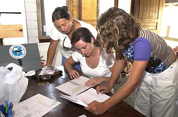 Estagiárias ensinam ecovoluntária, a jornalista Cristina Bodas, a marcar na carta náutica a localização das baleias