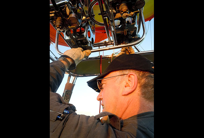 O piloto Nigel controla a altura do balão e conversa regularmente por rádio com outros colegas sobre as condições.