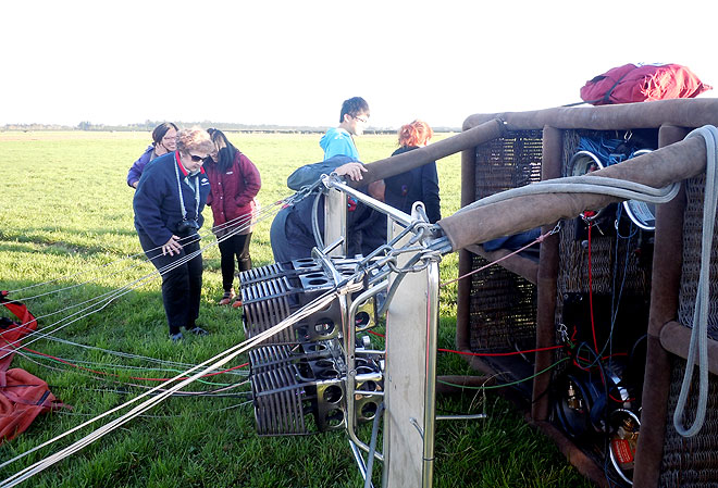 Na descida, o cesto acabou virando de lado, mas não houve nenhum problema com os turistas. O único problema foi que ele aterrissou em uma fazenda de gados e havia muitas fezes na grama.