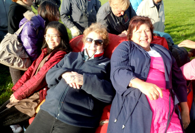 Os organizadores do passeio pedem para as mulheres se deitarem na lona para que o gás saia.