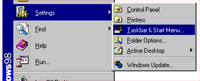 A outra maneira funciona no Windows 95 também. Clique no botão Iniciar (Start), e selecione Configurações (Settings). Agora selecione a opção Barra de Tarefas e Menu Iniciar (Task Bar & Start Menu).