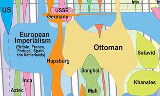 Chama-se World GeoHistogram e combina geografia e tempo numa estrutura visual unificada que mostra claramente a ascensão e queda dos impérios. A história não é um jogo de soma zero em que, quando um império cai, outro surge imediatamente, é um pouco mais complexo, mas o gráfico permite-nos apreciar de forma muito visual não só os impérios que se sucedem, como também aqueles que se desenvolvem em paralelo e com os quais podem entrar em conflito.