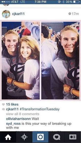 Supostamente a menina que aparece na imagem fez o seguinte comentário: "esta é a sua maneira de terminar comigo". A postagem e a conta da garota foram deletadas, mas a imagem foi compartilhada por outros usuários e ganhou os sites de notícias nos Estados Unidos.