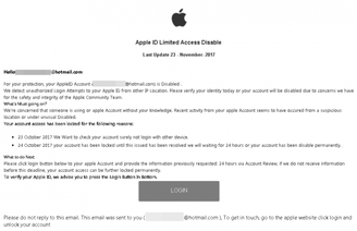Para desbloquear, a página pede para que o usuário clique em um botão para fazer o login, fornecendo os seus dados da AppleID. O link redireciona o usuário a uma página da web falsa, que parece estar dentro do próprio site da Apple, e é lá que o cliente deveria inserir suas informações pessoais.