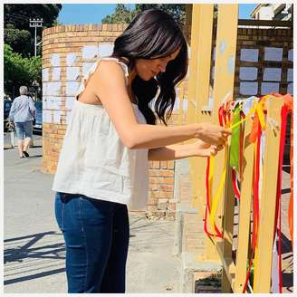 Em uma parada tranquila durante uma turnê real, Meghan amarrou uma fita no memorial em um posto dos correios, onde Uyinene Mrwetyana, estudante de 19 anos, foi atacada no mês passado. O ataque levou mulheres indignadas a marchar nas ruas das principais cidades e a se unir a uma campanha online chamada #AmINext.