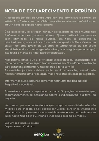 A assessoria jurídica do Grupo AgroPlay, que administra a carreira da artista Ana Castela, vem a público repudiar os ataques proferidos por influenciadoras digitais nesta semana.
