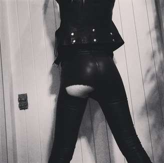 Na imagem, a jovem está de costas e aparece somente sua perna. A intenção da pose é mostrar o enorme rasgo na calça.