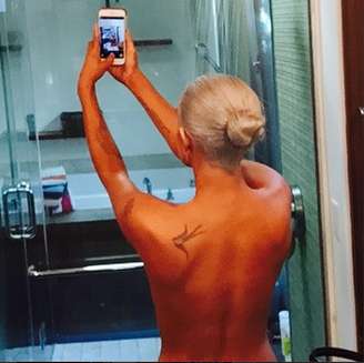 No banheiro, se preparando para a banho, ela tirou uma selfie revelando suas costas no reflexo do espelho. "Me divertindo na sessão de fotos hoje", escreveu na legenda.