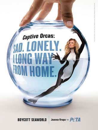No anúncio, Joanna aparece dentro de um aquário, com o olhar assustado seguido da mensagem: "orcas em cativeiro: tristes, solitárias, longe de casa". Os seios e barriga estão pintados de branco, enquanto o restante do corpo foi coberto por uma tinta preta.