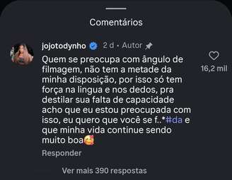 A reação veio rápido. Incomodada, Jojo decidiu responder publicamente e comentar o teor das mensagens recebidas.
