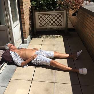 Enquanto os brasileiros tiram as roupas mais pesadas no armário, Caetano Veloso aproveita o verão no hemisfério norte. Em turnê pela Europa, ele curtiu o sol no chão da varanda do hotel usando bermuda, camisa aberta e chinelos de tecido bem confortáveis.