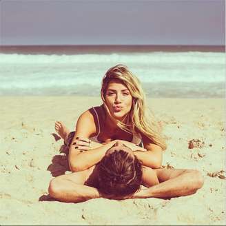 A atriz postou uma foto em que aparece deitada no marido e mandando um "beijinho" para o fotógrafo Eduardo Bravin, que clicou o momento do casal.