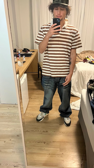 Na foto, Bem aparece usando uma blusa polo listrada, calça jeans e tênis. O registro foi feito em um ambiente simples, com uma cama ao fundo.
