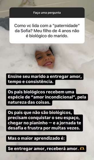 "Ensine seu marido a entregar amor, tempo e consistência. Os pais biológicos recebem uma espécie de amor incondicional pela natureza das coisas", escreveu ele. Na sequência, destacou os desafios de quem assume a paternidade por escolha: "Os pais que não são biológicos precisam conquistar o seu espaço, chegar no pianinho e a jornada te desafia e frustra por muitas vezes. Mas o maior aprendizado é: se entregar amor, receberá amor".