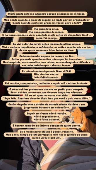 Para Lucas, o novo relacionamento não apaga a história que viveu com a jovem, que realizou os sonhos de se casar e ser mãe antes de morrer aos 19 anos. "Seguir em frente não é esquecimento. É honrar também os últimos desejos de quem partiu. O meu tempo de luto pertence a mim, não à opinião de quem nunca viveu o que vivi", disparou.