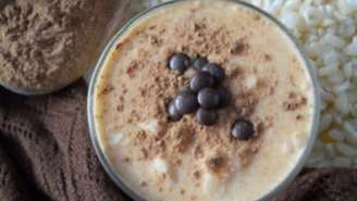 - Em outro recipiente, misture o cacau em pó e o creme de leite até dissolver, depois junte na canjica.
