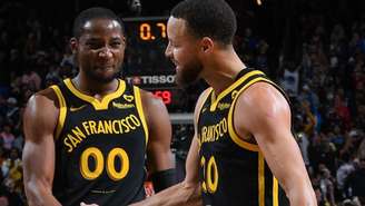 Provável quinteto do Golden State Warriors: Stephen Curry, Brandin Podziemski, Andrew Wiggins, Jonathan Kuminga e Draymond Green.
