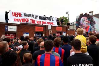 Torcedores do Crystal Palace protestam nos arredores do estádio Selhurst Park, nesta quarta-feira (16) contra a decisão da Uefa de excluir a equipe da próxima Liga Europa. A manifestação foi pacífica e foi organizada pelo grupo de ultras Holmesdale Fanatics.