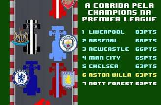 Com isso, estes times abaixo, que sonham com as quatro vagas para a Liga dos Campeões, estarão certos em competições europeias se terminarem em sexto ou sétimo, o que seria uma consolação. Enfim, vamos a eles.