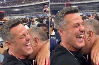 Bastante emocionado, Marcos Braz diretor de futebol do Remo chora e abraça o ex-goleiro Júlio César no gramado do Mangueirão, após o acesso do Leão Azul para Série A do Brasileirão.