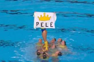 Numa faixa, as nadadoras estamparam o nome do maior jogador da história do futebol, junto com o desenho de uma coroa. Pelé morreu em 29/12/2022, aos 82 anos, em São Paulo. E seu nome é referência não apenas no futebol. Afinal, Edson Arantes do Nascimento deixou um legado como grande esportista, eleito Atleta do Século e inspiração para jovens do mundo inteiro.