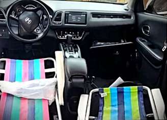 Durante a ação conjunta com a Guarda Municipal, um veículo foi abordado com cadeiras de praia instaladas no lugar dos bancos dianteiros. Isso mesmo: nada de banco original, só improviso.