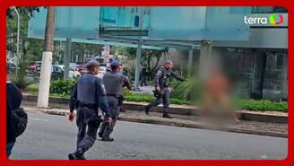 Vídeos que circulam nas redes sociais mostram o homem caminhando e sentado na calçada da Avenida Faria Lima. Em outro registro, ele aparece contido no chão ao lado de policiais.