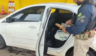 Os policiais pararam um HB20 com placas de Paulo Frontin (PR) e, durante a vistoria, encontraram diversos tabletes de maconha escondidos em sacos de cereais, sobre o banco traseiro do veículo.