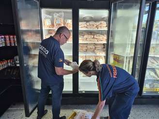 Em Imbé, seis estabelecimentos foram vistoriados. No município, cerca de uma tonelada de produtos foi retirada de circulação, incluindo carnes, pescados, itens de padaria, bebidas lácteas, embutidos e fraldas descartáveis. As principais irregularidades encontradas foram alimentos armazenados fora da temperatura adequada, produtos sem comprovação de procedência e mercadorias com prazo de validade vencido.
