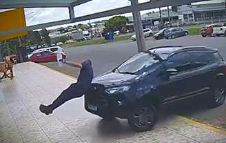 Imagens mostram o motorista manobrando e atingindo o policial, que foi arremessado para dentro de um estabelecimento comercial. Testemunhas relatam que o condutor chegou a sair do veículo e entrou no local onde o agente caiu.
