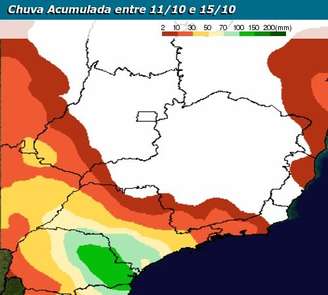 A figura também mostra que, apesar do bom prognóstico de chuva para parte do interior paulista, a maior parte da Região Sudeste terá tempo seco nos próximos dias.
