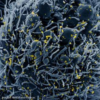 Esta é uma imagem real do novo coronavírus SARS-CoV-2, que provoca a grave doença respiratória denominada covid-19. A imagem é uma micrografia eletrônica de varredura colorida de uma célula apoptótica (azul) infectada com partículas do vírus SARS-COV-2 (amarelo), isoladas de uma amostra de paciente infectado.