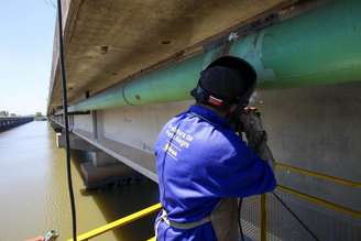 Uma equipe de alpinismo industrial foi mobilizada para a execução do serviço, tendo em vista que a adutora é suspensa sob a ponte. Intervenções desse tipo exigem que os técnicos atuem em espaço confinado, por meio de uma estrutura semelhante a uma gaiola - que, somada aos demais equipamentos de proteção, garante a segurança dos trabalhadores.