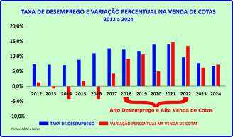 "Desemprego e renda, sem dúvida, andam de mãos dadas, porém, surpreendentemente, ao compararmos suas taxas anuais com as variações nas vendas de cotas no ano, observou-se uma correlação negativa de apenas (-17,7%). Vale esclarecer que as correlações negativas indicam que quando uma variável sobe a outra cai, e vice-versa, ou seja, se os percentuais de desemprego estão elevados, as vendas caem, e se inversamente estão em patamares baixos, as adesões crescem, mas, o que mais chamou atenção no estudo foi que essa relação, embora exista, foi baixa", detalha Barbagallo.