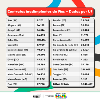 Veja a relação da quantidade de contratos inadimplentes do Fies por estado: