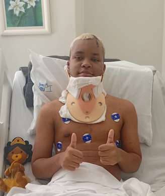 Gabriel segue em acompanhamento médico, ainda utilizando colar cervical, mas consciente e reagindo bem ao tratamento, demonstrando força e sinais claros de recuperação.