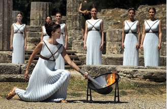 Centenas de pessoas observavam em silêncio perto das ruínas do templo dedicado à deusa Hera em Olímpia, no sul da Grécia, onde os gregos competiam nos Jogos da antiguidade. O ritual com a alta sacerdotisa e a tocha foi criado oito décadas atrás para os Jogos de Berlim.