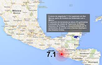 O sismo de magnitude 7.1 foi registrado em San Marcos, perto da fronteira da Guatemala com o México. Prédios da cidade ficaram com rachaduras e houve também deslizamentos de terra na região, segundo autoridades locais.