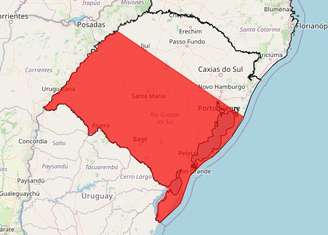 O Instituto Nacional de Meteorologia (Inmet) emitiu alerta vermelho de grande perigo para tempestade em grande parte do Rio Grande do Sul nesta quinta-feira (12). O aviso é válido do meio-dia até as 23h e indica risco elevado de eventos severos.