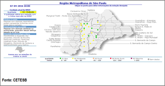 A piora da qualidade do ar foi observada ontem também no interior e no litoral. Entre 17 e 19 horas, as medições das CETESB indicavam qualidade do ar ruim por excesso de ozônio em 10 locais da Grande São Paulo: Diadema, São Bernardo do Campo (Centro), São Caetano e nos bairros da capital Capão Redondo, USP (Ipen), Ibirapuera, Nossa Senhora do Ó, Parelheiros, Santana e Santo Amaro. No interior, Santa Gertrudes também teve qualidade do ar ruim, mas por aumento da concentração de material particulado MP10.