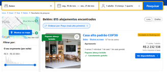 Ao considerar o filtro de ‘melhor pontuação e preço mais baixo’, pesquisando por estadias em Belém entre os dias 10 e 21 de março, também onze dias, mas longes da data da COP, as 10 principais acomodações listadas custam entre R$ 560 e R$ 1500 para todo o período. Fazendo a mesma busca, mas preenchendo com as datas em novembro, o primeiro resultado destacado cobra R$ 25 mil pelas onze noites -- o preço das 10 principais acomodações listadas nesse filtro variam entre R$ 1 mil e mais de R$ 580 mil.