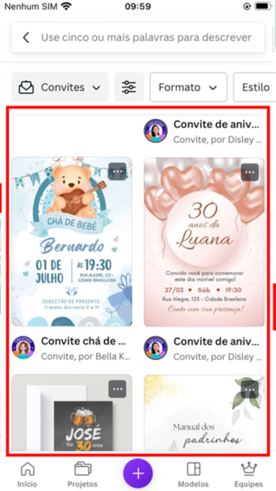 Ao clicar em "Vídeo" no menu abaixo da barra de pesquisa, você verá as opções de produções que podem ser editadas, como vídeos especificamente para Facebook, YouTube ou Reels do Instagram.