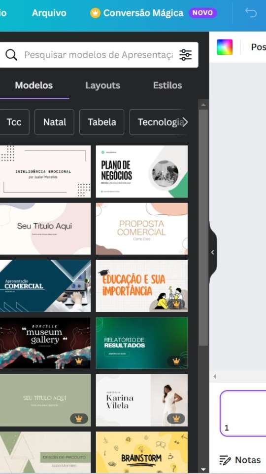 Após logar em sua conta, o usuário deve selecionar "Apresentações" para criar slides. As funcionalidades da barra lateral servem para editar os templates, mudando a paleta de cores, as imagens de fundo e os tipos de fonte para o texto.