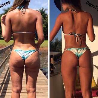 Para mostrar as mudanças, Adriana publicou fotos de costas do antes e depois. Na primeira imagem ela aparece com cintura mais larga, coxas maiores e celulite no bumbum. Na segunda foto, exibe o corpo bem mais sequinho.
