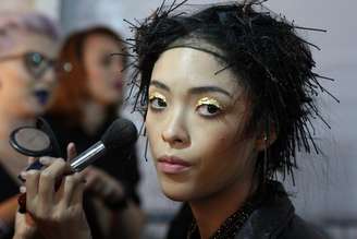 Para preparar as modelos com esse look, foram colocados dezenas de grampos, abertos em V e torcidos. "Para ficarem enrolados tipo sarará, demora mais de uma hora", afirmou Carla. Na boca e nos esmaltes são também três cores usadas: azul, vermelho e laranja. Nos olhos, sombra dourada, chamada "folhas de ouro", um tipo de maquiagem cenográfica.