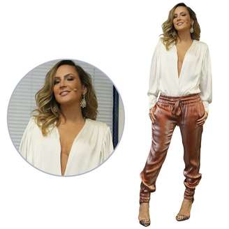 No programa The Voice Brasil, Claudia Leitte usou camisa de seda com decote profundo, da Água de Coco, junto com calça Gucci.