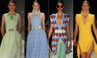 Outra peça forte para o verão também apareceu: os maxicoletes. Claro que algumas combinações são restritas às passarelas, mas dá para imaginar uma peça exuberante, com outra básica. Toda esssa mistura vinha acompanhada de maxicoletes ou maxicintos em desenhos geométricos nas cores da coleção, assim como os calçados em vários tons. No final, a linha festa trouxe fios metalizados, como o lindo vestido verde e prata, com saia mais ampla, desfilado por Aline Weber.