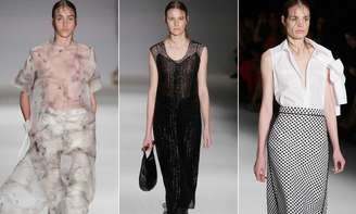 Do universo masculino foram emprestadas camisas brancas, que se transformavam em longos confortáveis com abotoamento atrás, em túnicas longas com estampas abstratas em tonalidade cinza.