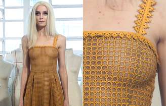Entre os trabalhados empregados, estão os cortes a laser, o tressê com fios de couro de 3 milímetros e a peça com aplicação de 600 metros de rolotês finíssimos de couro em desenhos orgânicos, num conjunto de saia evasê e jaqueta preta, que de longe parece jacquard. "Quando fui à fábrica, a máquina para fazer os rolotês (tiras do material costurado do avesso e virado no direito) ainda estava em teste. "Mas eu queria o produto e consegui que eles fizessem", contou a obstinada Patricia.