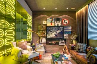 No Estúdio do Jovem Executivo, de Alexandre Magno, as imagens da TV são projetadas num painel de vidro que pode ser visto da sala e do quarto